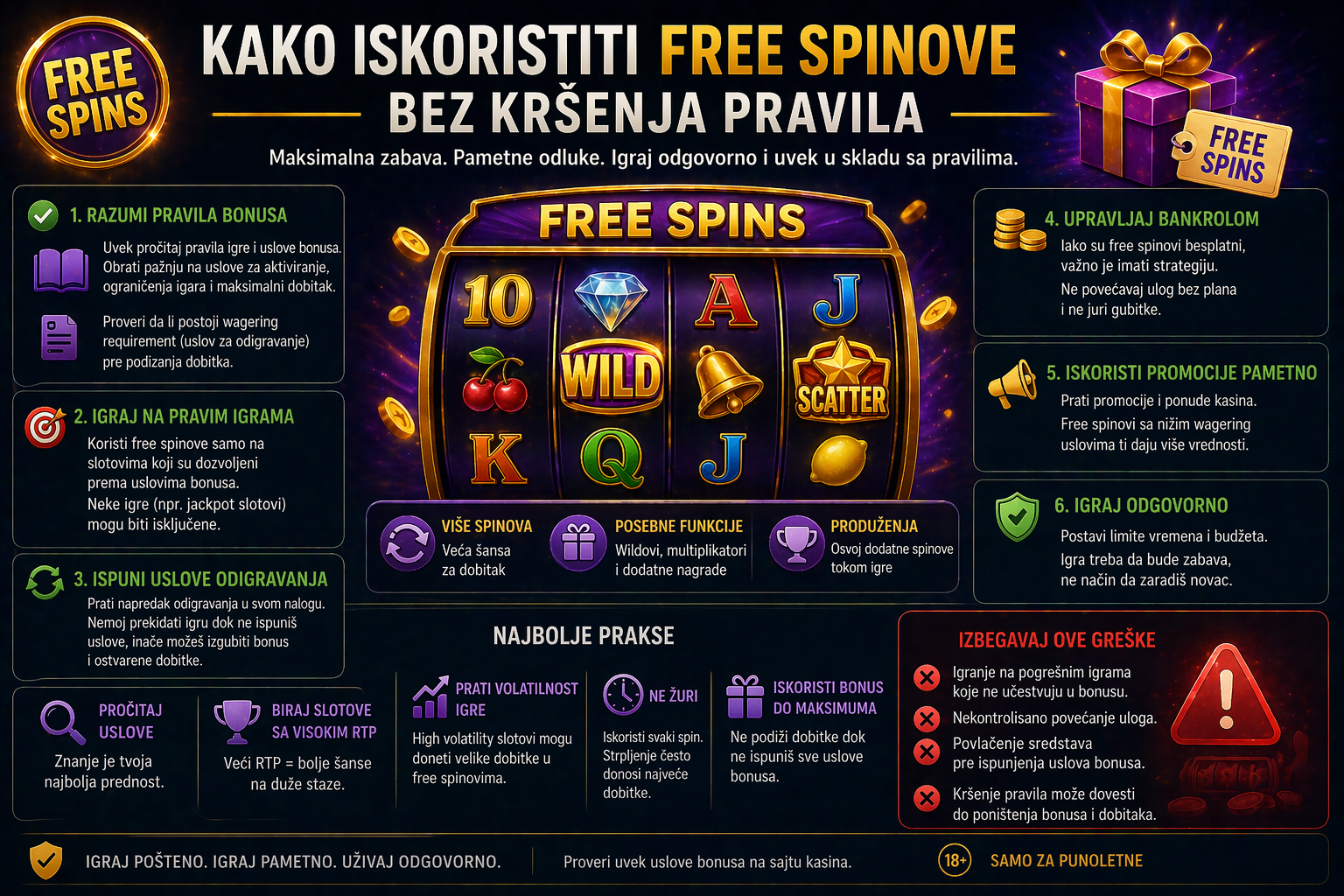 Zato je najpametniji pristup jednostavan. Pročitaj pravila, drži se dozvoljenih igara, prati limite i nemoj žuriti. Free spinovi imaju smisla samo kada ih koristiš disciplinovano, a ne naslepo.